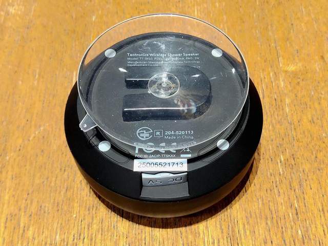 在底部的位置上,这里带来了蓝牙音箱的独特与魔力吸盘的卡口设计,让魔力吸盘能与音箱主体进行拆解使用。这几乎与音箱直径一样大的魔力吸盘,给蓝牙音箱带来了稳定吸力,保证了音箱稳定不容易掉落。同时,还在吸盘下方,清晰地印刷有Taotronics吸盘式蓝牙音箱对应的产品铭牌信息和相关的安全认证logo。