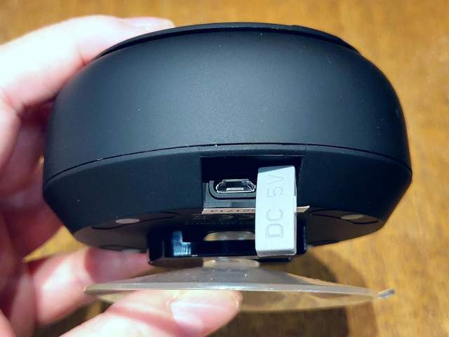 观察蓝牙音箱底部,可以发现在一侧位置上有一处具有鲜明对比灰白色的地方,这里就是音箱附带印有“DC 5V”防水胶塞的充电接口。但遗憾的是,Taotronics吸盘式蓝牙音箱的充电接口并不是带来现时主流支持正反插的Type-C接口,而是以前的micro USB接口。这样在充电的时候,需要注意正反的插线使用了。