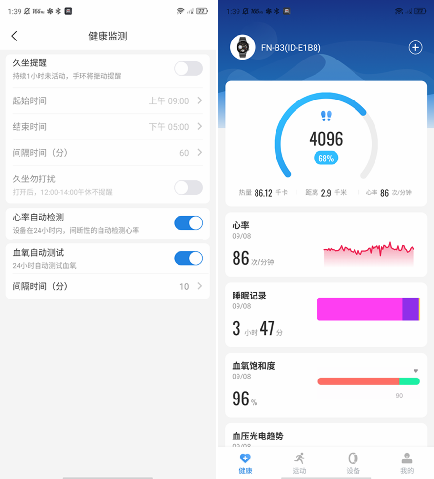 通过在先行者健康APP的健康监测功能界面,选择开启心率自动检测、血氧自动测试功能,并且设置测试的间隔时间,C9智能手表便会自动检测心率、血氧测试数据。心率检测情况会自动在手表以及APP上绘画出心率监测图,并且APP上会自动统计最低心率以及最高心率数值。