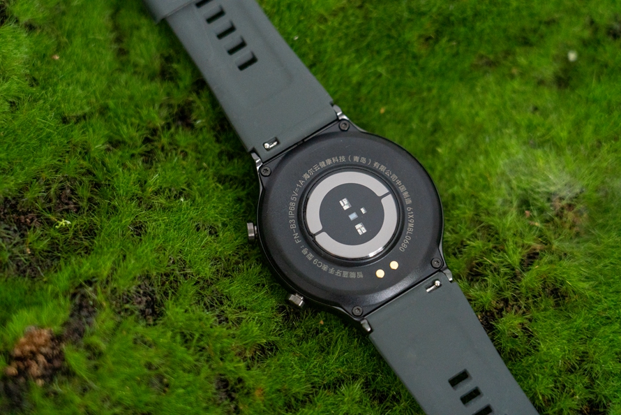 在C9智能手表底部中间配备了用于检测身体数据的传感器,这是检测身体数据准确性的关键。而在右侧则是磁吸充电点,配备的磁吸充电头在充电时可自动吸附在其上方,充电也会便利一些,但是充电头的磁吸力有些稍弱,不小心触碰便会脱落,有待改进。