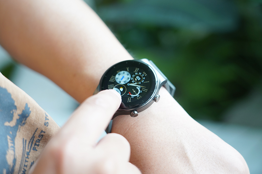 先行者智能蓝牙手表C9的外观与市面上的其它智能手表大同小异,采用了是一块圆形的金属表盘,搭配了一块1.28英寸的圆形钢化屏幕,可较为清晰的观看表盘内容,同时屏幕可支持触控操作,可直接触碰选择表盘功能等操作,交互要便利许多。